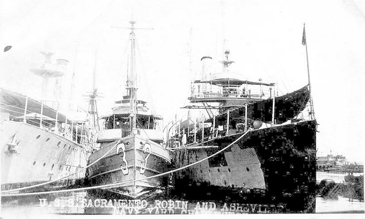 113k | c. 1920 Sacramento, USS Robin (AM 2), and USS Asheville (PG 21) at Charleston, SC |