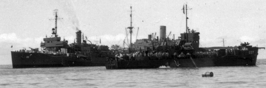 51k | 20 April 1944 Finschaven, New Guinea USS LCI-227 is in the foreground U.S. Army Signal Corps photo SC259939 from the National Archives |