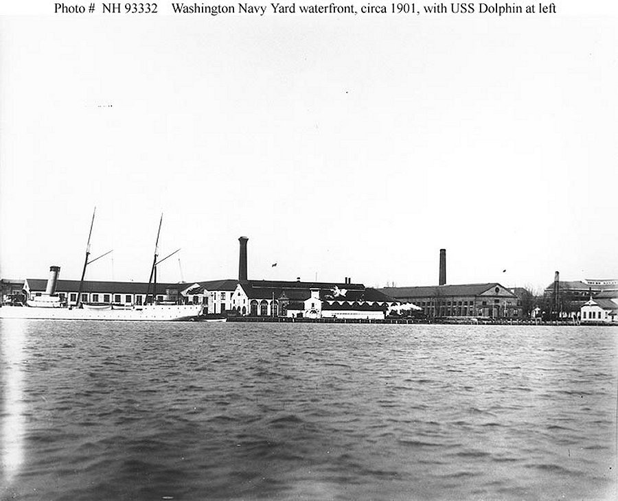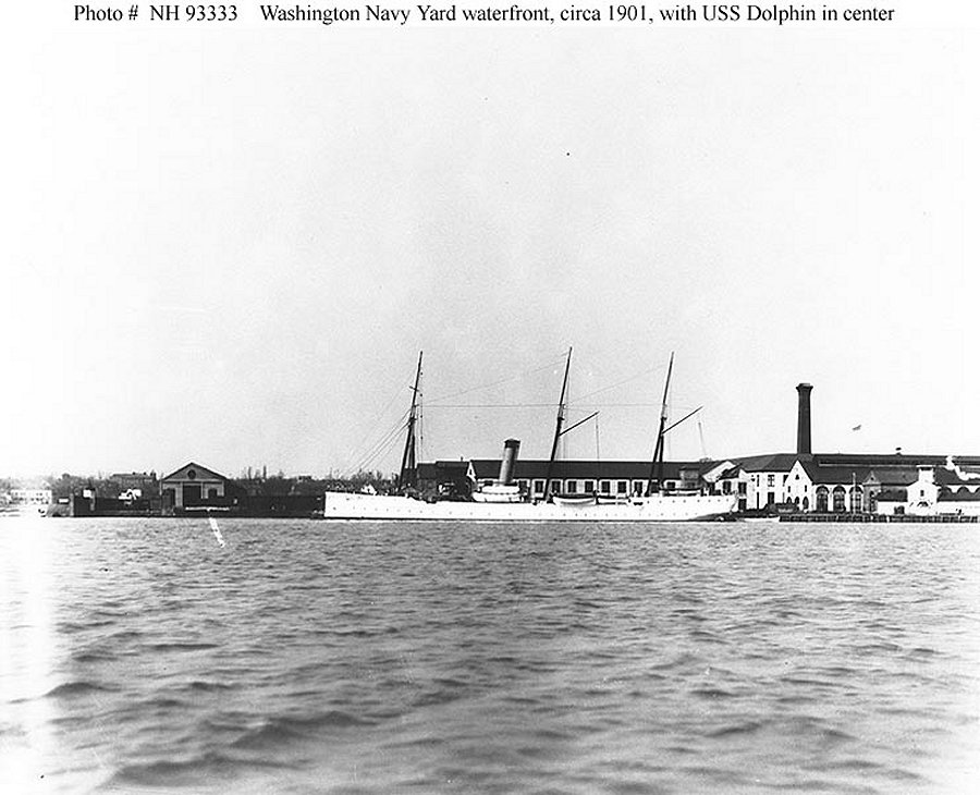109k | c. 1901 Dolphin docked at the western end of the Washington Navy Yard waterfront, District of Columbia. The view looks north. The old experimental battery building is at the right Naval History and Heritage Command photo NH 93333 |