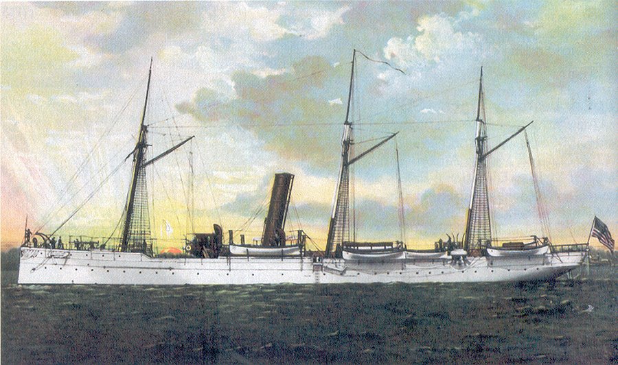 468k | Original photo: c.1895 This is the ship that carried the remains of James Smithson (of the Smithsonian Institution) to the U.S. Replacement photo: Photo from The American Navy; Belford, Middlebrook and Co., Chicago - 1898 |