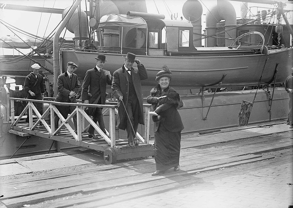 172k | Secretary of the Navy Josephus Daniels (second from right) and his wife disembark from the Dolphin following the U.S. Navy