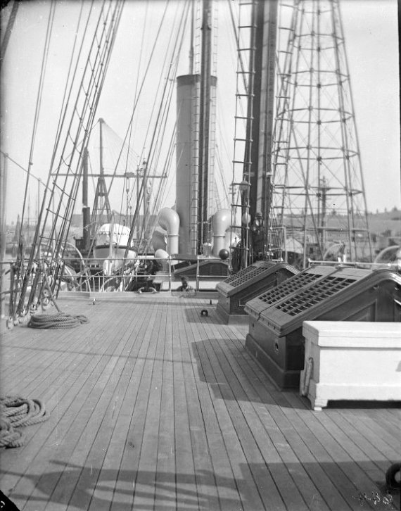 91k | Brooklyn Navy Yard, New York Main deck, looking forward Photo from the George E. Stonebridge Photograph Collection, 1897-1918 at the New-York Historical Society Museum & Library website |