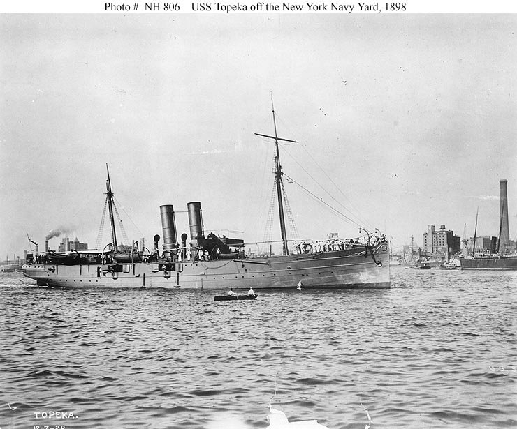 96k | Off the New York Navy Yard, 1898. The receiving ship USS Vermont is visible at right, beyond Topeka's bow U.S. Navy photo NH 63371 |