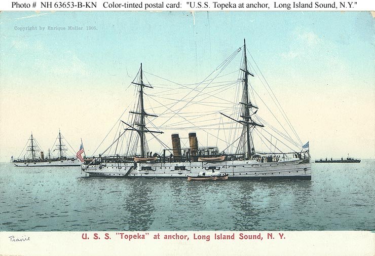 98k | Color-tinted postcard of a photograph (above) copyrighted by Enrique Muller, 1905. It shows Topeka at anchor in Long Island Sound, New York, circa 1904. Ships present in the background include USS Prairie (left) and a torpedo-boat destroyer (right) U.S. Navy photo NH 63653-B-KN |
