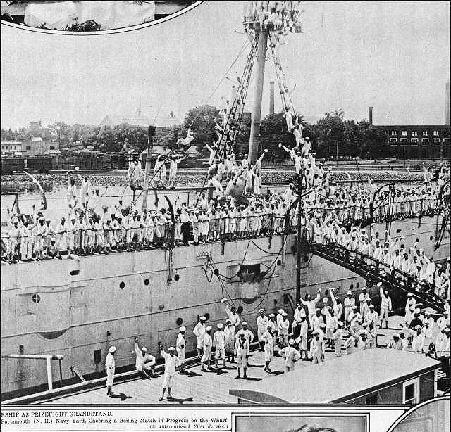134k | Photo caption: WARSHIP AS PRIZEFIGHT GRANDSTAND Hundreds of Sailors on the Topeka, at the Portsmouth (N.H.) Navy Yard, cheering a boxing match in progress on the wharf © International Film Service photo from the 22 July 1917 edition of the New York Times |
