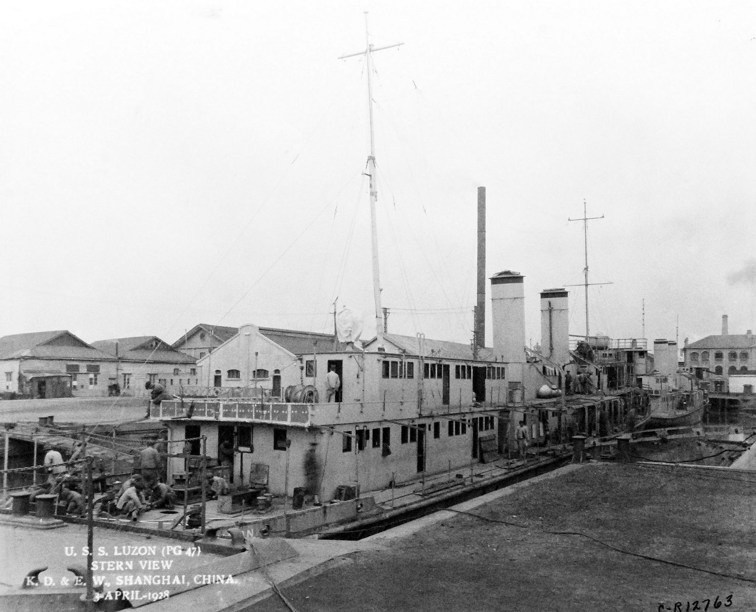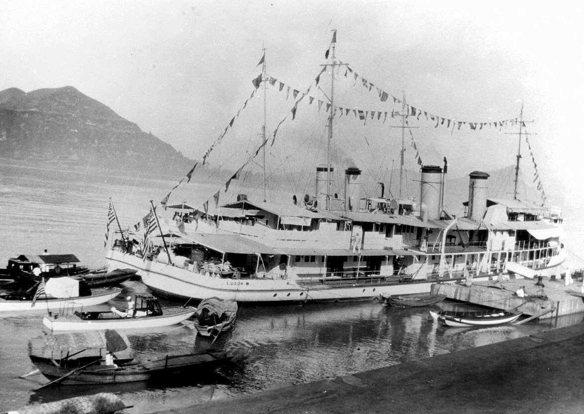 219k | Luzon on 4 July 1932, at Ichang, China, with USS Guam (PR-3) alongside "dressed" for the 4th Courtesy of Mr. W. G. Kelly, 1970 Naval History and Heritage Command photo NH 81249 |