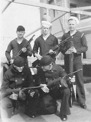 29k | Yangtze Patrol sailors on the river gunboat Luzon in 1932, armed with a Winchester Model 1897 shotgun. Model 1928 Thompson submachine guns with L drum magazines, Model 1918 Browning Automatic Rifle (BAR) and a Model 1917 Lewis Mark IV machine gun Photo by Finn W. Outler from Pinterest |