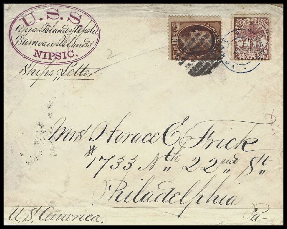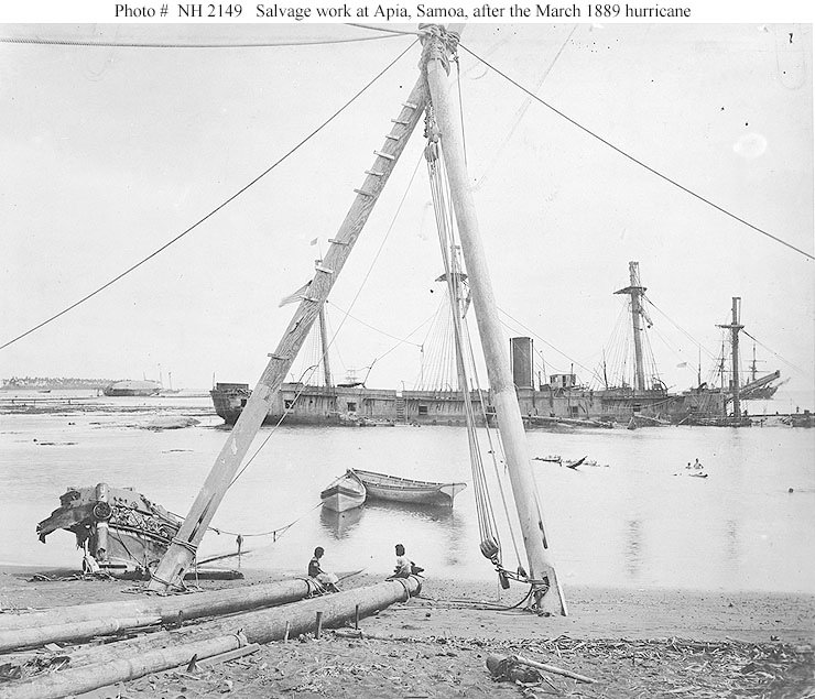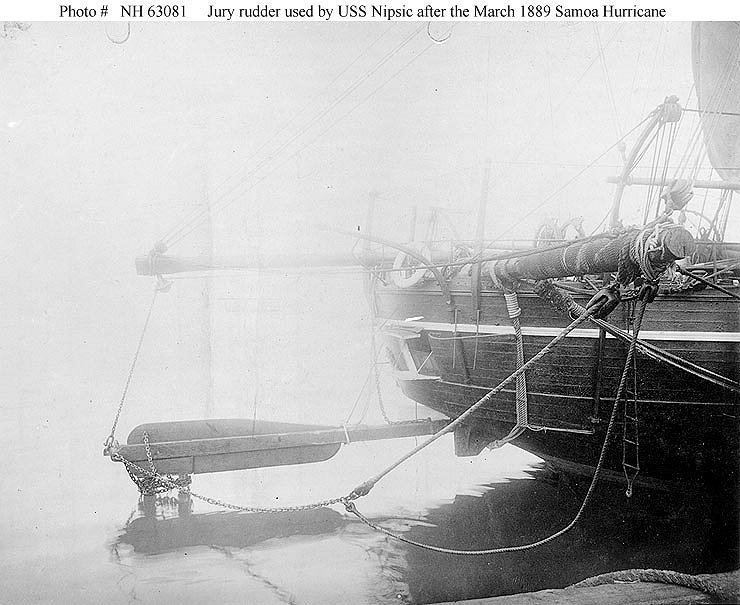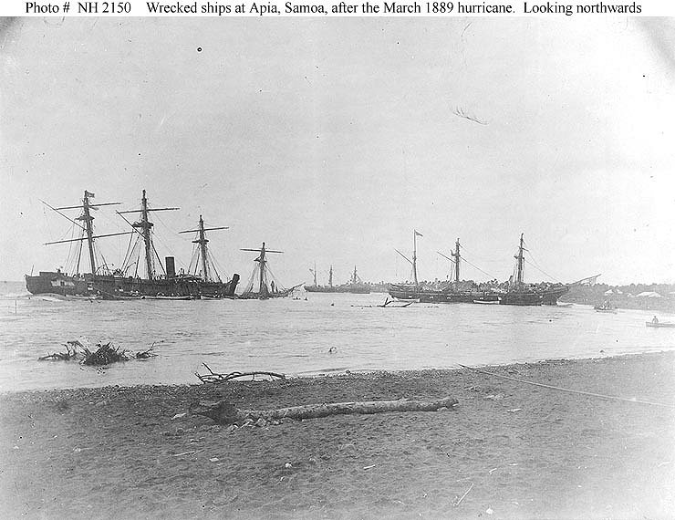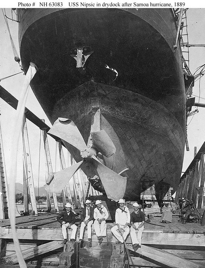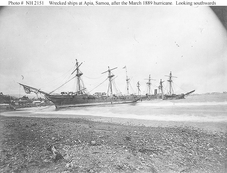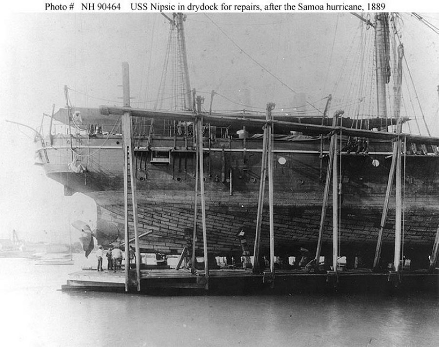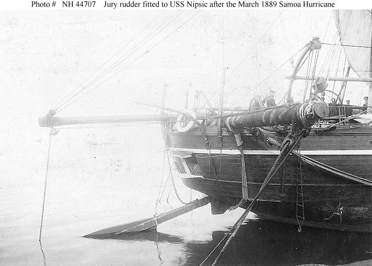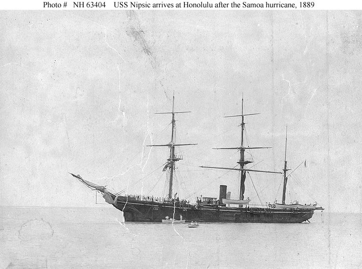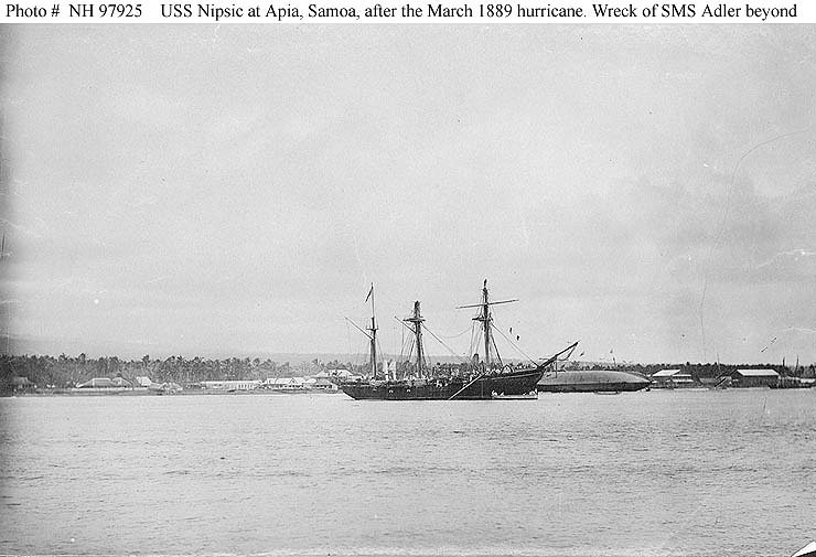 Following overhaul, Nipsic went to the Pacific by way of Cape Horn in early 1888. Later in the year she became the station ship at Apia, Samoa, providing U.S. Naval presence there during a tense period with Germany over that nation's attempts to establish a Samoan government of its choice. On 15-16 March 1889, she was in Apia Harbor during a violent hurricane that wrecked two German and two U.S. Navy warships. Nipsic and the German corvette Olga survived the storm, but both were driven ashore and seriously damaged. During the next two months, Nipsic was repaired enough to allow her to depart for Honolulu, Hawaii, where she arrived in early August 1889.