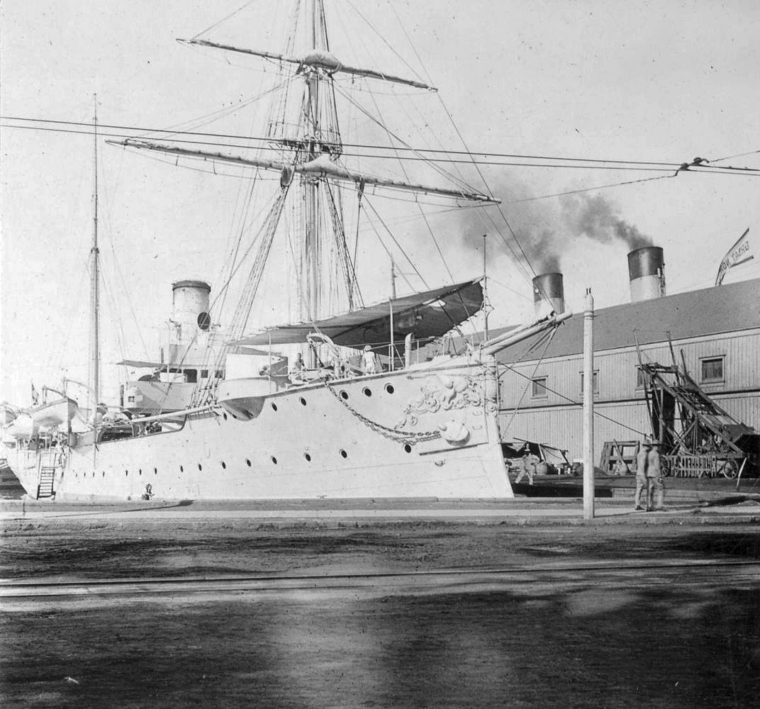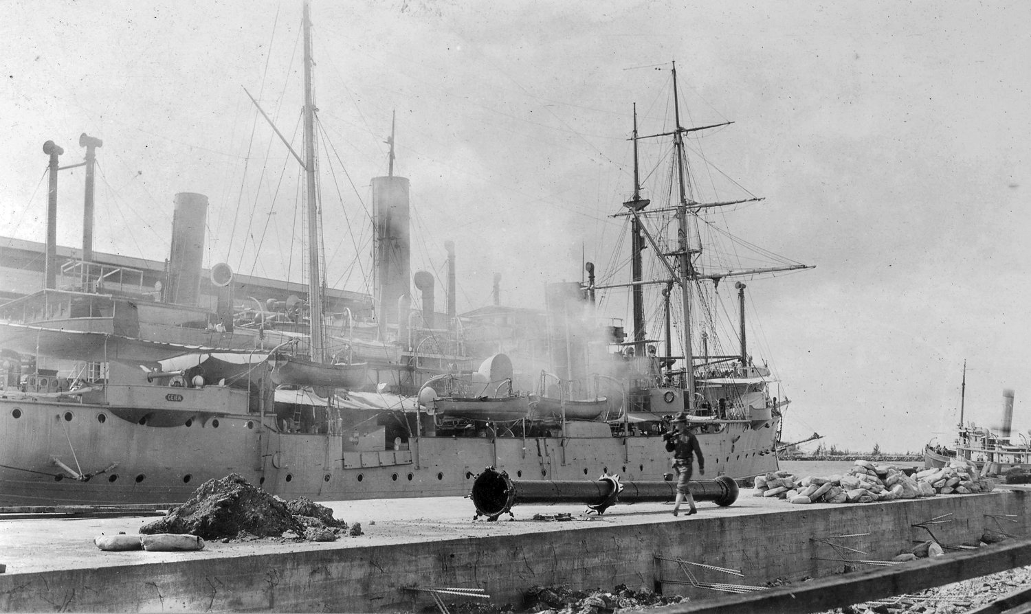 73k | The unprotected cruiser SMS Geier entering Havana Harbor, Cuba, in 1898 Image from Marine Rundschau, 1899. Pub. Ernst Siegfried Mittler und Sohn (and son), Berlin |