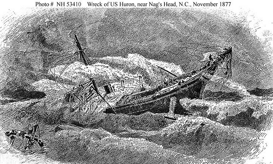 Commander George P. Ryan was born in Massachusetts, May 8, 1842. He was appointed from the State to the Naval Academy Sept. 30, 1857. He was graduated with honor in 1860. In 1861 he was attached to the brig Bainbridge as Midshipman and from 1862 to 1865 was on special duty on the steam-sloop Sacramento. He received his commission as Lieutenant July 16, 1862. In 1865 and 1866 he was an officer of the steamer Lenapee. He was commissioned Lieutenant Commander July 25, 1866. From 1867 to 1869 he was Professor of Physics and Chemistry and from 1871 to 1872 was the Professor of Natural and Experimental Philosophy at the Naval Academy. Subsequently he was sent on special service in the frigate Sabine. On September 19, 1874 he was made a full commander. He was assigned duty on the Swatara in the American expedition to observe the transit of Venus, and had charge of a station in the Indian Ocean. On his return he was given the command of the Huron. He had gained a very high reputation in the service, and was regarded as an exceedingly capable officer. The Huron, built with funding authorized by the 42nd Congress, was a Federal gunship. Built after the Civil War in 1874 and commissioned in November 1875, the Huron was powered by both sail and steam, was 175 feet long, displaced 541 tons and carried four 9 inch guns. On November 23, 1877 she departed from Hampton Roads for the coast of Cuba on a scientific expedition. Her complement of 116 men and 15 Marines were all hand picked. She headed south out of the Chesapeake Bay and down the East Coast. As she passed by the Cape Henry Light around midnight, all aboard knew the predictions of bad weather had been correct. The sea grew rougher and the wind gained strength, forcing the ship leeward 10 degrees. Nevertheless, the Captain, Commander George P. Ryan, chose to continue onward while hugging the coast. That soon proved to be the wrong choice. By 1:00 A.M., with the winds now at gale force, the ship was hitting bottom on the sand bars off Nags Head. The striking of the hull on the sand, the wind, and the waves all conspired to doom the ship. Eight officers and seventy-five crew members perished which included her captain Commander Ryan. Only 34 of her crew survived. The large loss of life was due in part to the fact that no one who saw the repeated flares and rockets that signaled for rescue, could help. In terms of lives lost, the Huron was one of the worst wrecks off the North Carolina coast. Although the Life Saving Service had been started three years prior to the Huron running aground, due to massive under funding the Service only manned stations in North Carolina for three winter months beginning December 1; one week to late to be of help to the crew of the Huron. The outrage over the Huron tragedy prompted Congress to fund the Service year-round. The Life Saving Service eventually evolved into the modern U.S. Coast Guard |