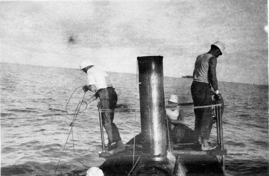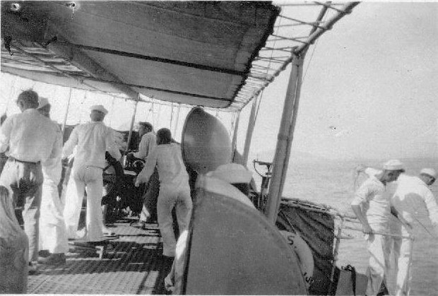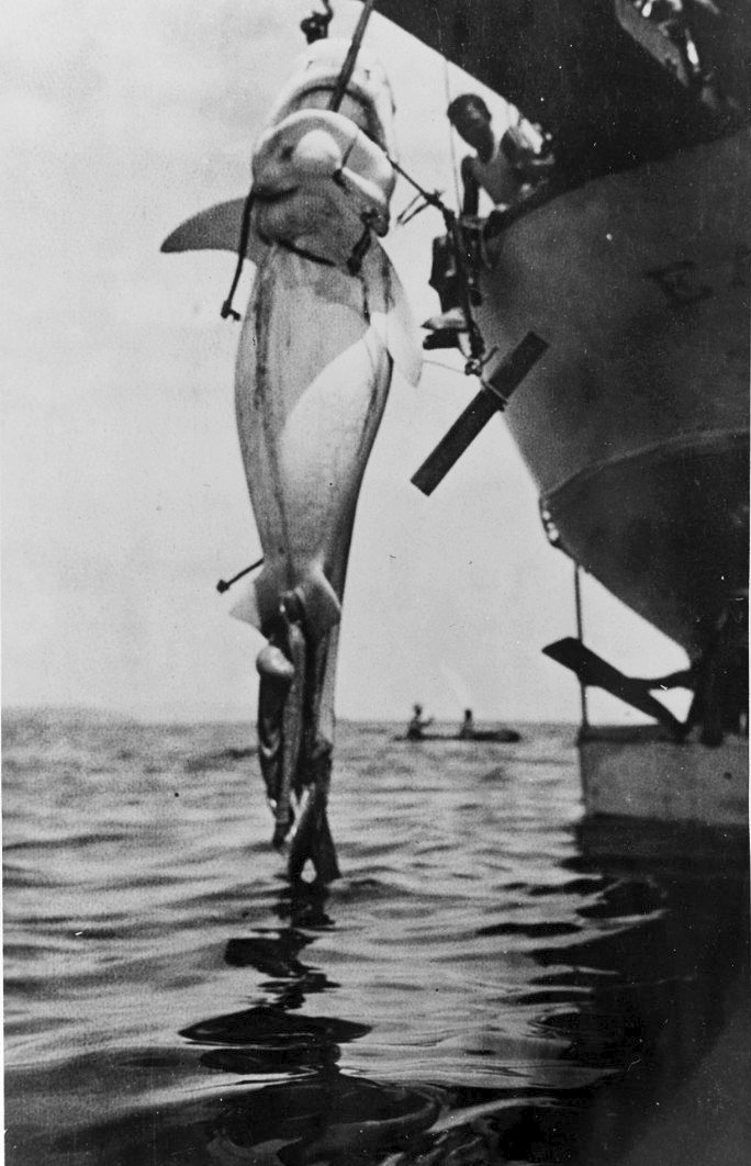 c. May 1916 Off Haiti Hoisting up a shark caught by the crew of USS Eagle Photographed by Mr. John G. Krieger, who was a machinist's mate on the USS Eagle, and donated by him in 1967 Courtesy of John G. Krieger, USN Naval History and Heritage Command photo NH 64950 |