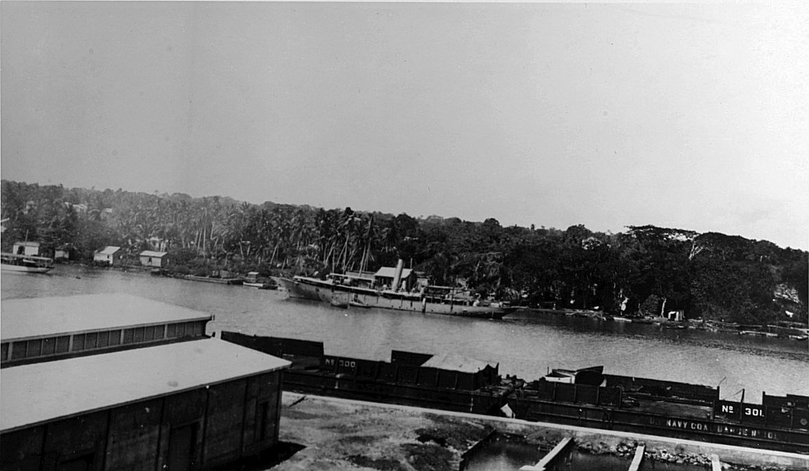 c. July 1917 Ozama River, Santo Domingo, Dominican Republic Navy Coal Barges Nos. 300 and 301 are in the foreground Photographed by Mr. John G. Krieger, who was a machinist's mate on the USS Eagle, and donated by him in 1967 Courtesy of John G. Krieger, USN Naval History and Heritage Command photo NH 64948 |