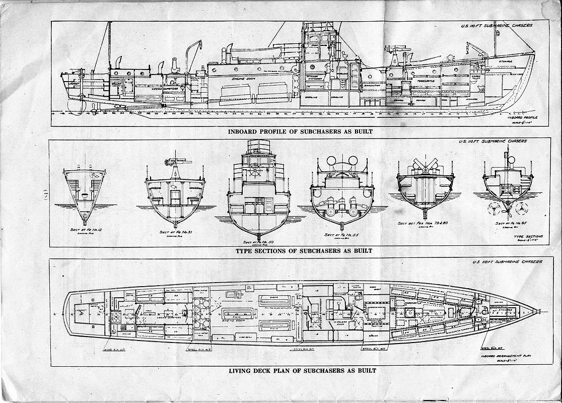 284k | Inboard profile, type sections and living deck plan for Submarine Chasers, as built Photo from "Sale of Vessels by the Navy," Navy Department, Bureau of Supplies and Accounts, c. April 1921 |