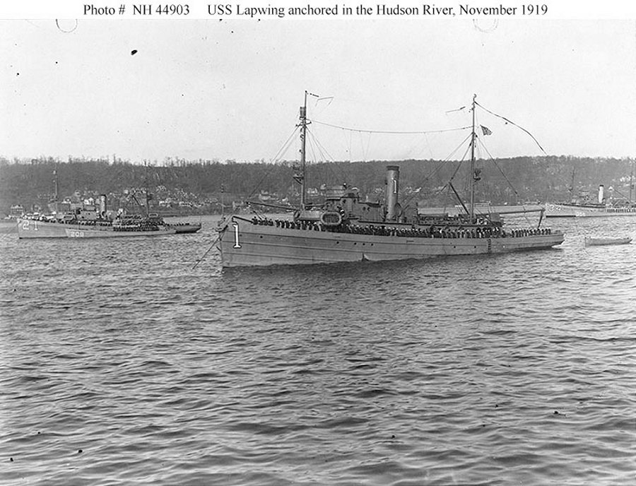 143k | Review of the Atlantic Fleet Minesweeping Squadron, November 1919. USS Lapwing (Minesweeper No. 1) and other ships of the squadron anchored in the Hudson River, off New York City, while being reviewed by Secretary of the Navy Josephus Daniels on 24 November 1919, following their return to the United States after taking part in clearing the North Sea mine barrage. The other ships visible are: USS Lark (Minesweeper No. 21), with USS SC-208 alongside (at left); and USS Swan (Minesweeper No. 34) with USS SC-356 alongside (at right). U.S. Navy photo NH 44903 |