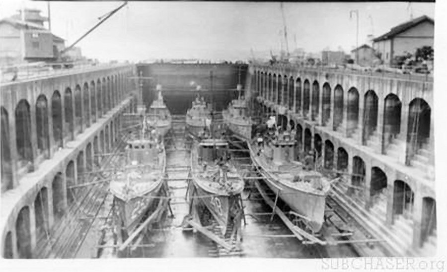 86k | Chasers in dry-dock, Devonport, England Left front is SC 259, middle front is SC 48, right rear is SC 354 |