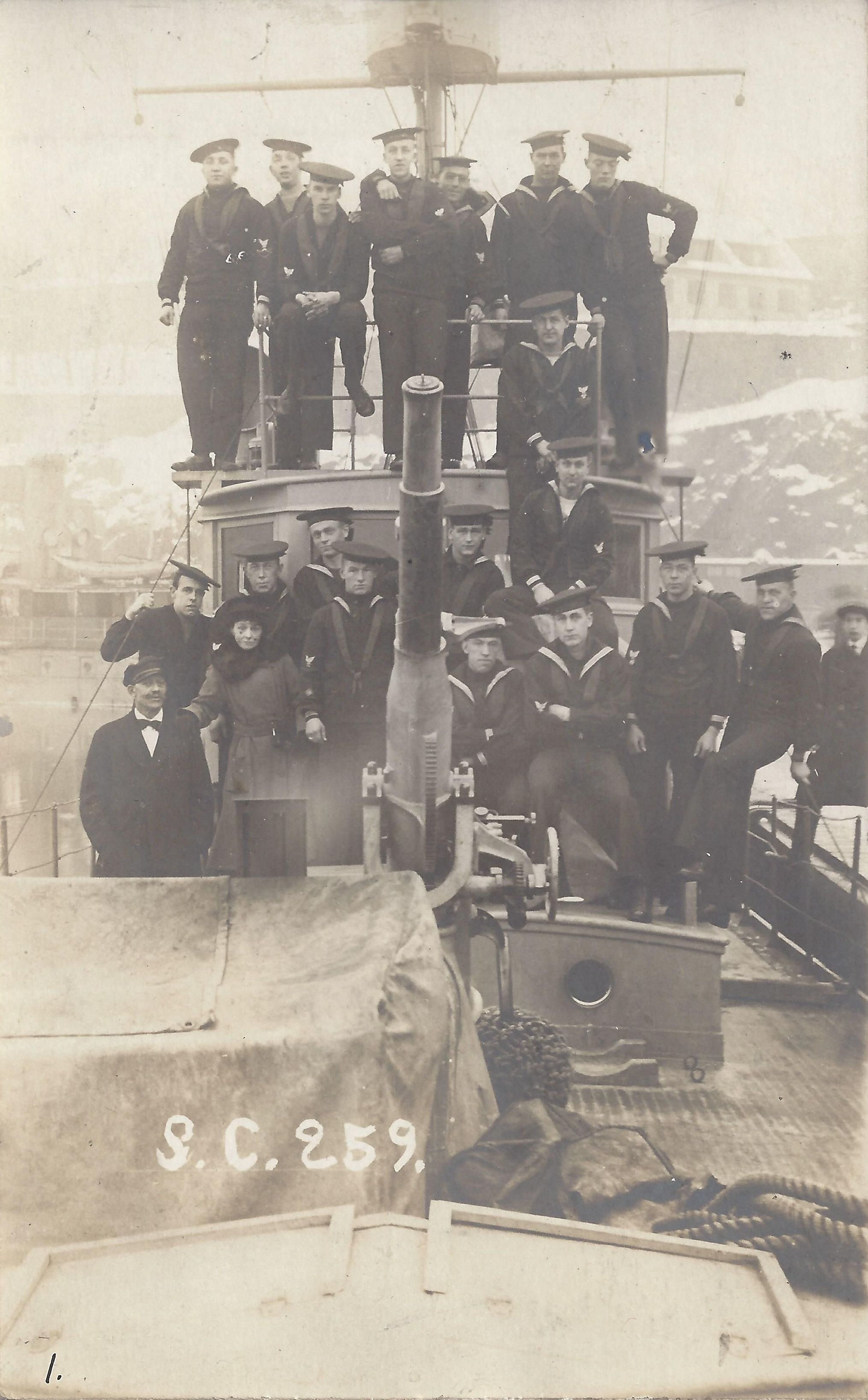 525k | RPPC of crew posing aboard SC-259, date and location unknown (possibly England?). Note the civilians among the crew. | Jay Milewski | |