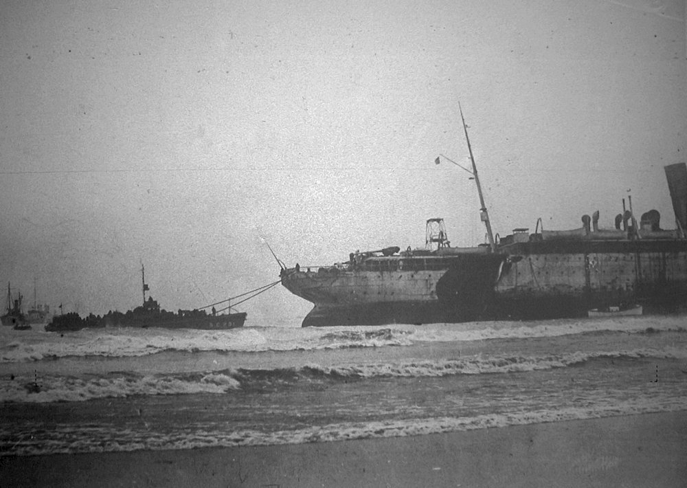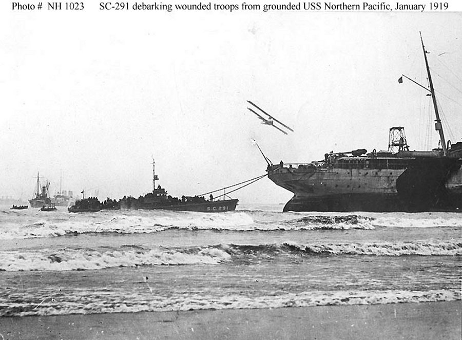 116k | Northern Pacific stranded off Fire Island, New York, in early January 1919, with USS SC-291 off her stern debarking wounded troops, and other ships standing by further offshore. An HS-1 type seaplane is overhead Collection of James Lee, USNRF U.S. Navy photo NH 1023 |