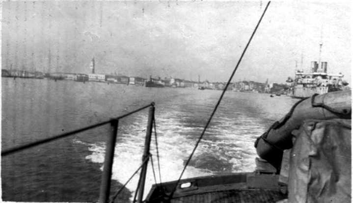 Leaving Venice, 2 March 1919. A French Battleship and Lions of St. Marks in back-ground. From the collection of Walter Allan McLerie |