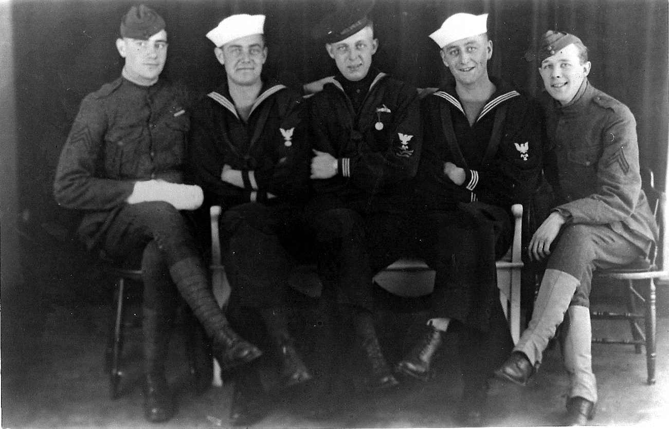 3 crew members of SC 324 (collection owner is right sailor) flanked by 2 soldiers, one who appears to be injured. From the collection of Walter Allan McLerie |