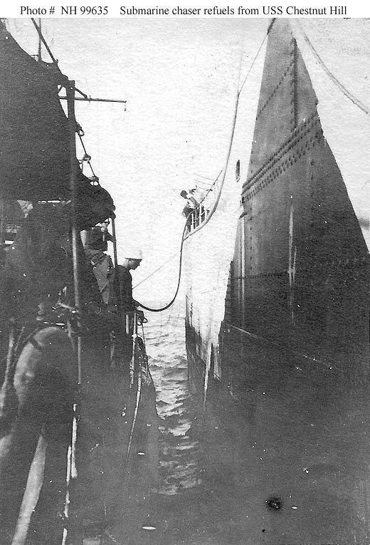 Chestnut Hill (ID 2526) refueling a submarine chaser (probably SC-331), at sea in October 1918, while she was escorting a group of submarine chasers from Bermuda to the Azores Collection of George K. Beach, who was a crewmember of USS SC-331 at the time U.S. Navy photo NH 99635 |