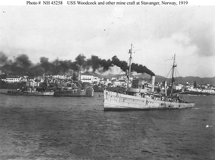 110k | While taking part in clearing the North Sea mine barrage, "The fleet put in (to) Stavanger, a bustling town in Norway, made prosperous by the war." (quoted from the original 1919 vintage caption). USS Woodcock (Minesweeper No. 14) is in the foreground. In the left background are (from front to rear): USS SC-356, USS SC-40, USS Eider (Minesweeper No. 17), USS Sanderling (Minesweeper No. 37) - probable identification, USS Auk (Minesweeper No. 38) and an unidentified minesweeper U. S. Navy photo from the Navy Recruitment Bureau, New York U.S. Navy photo NH 99789 |