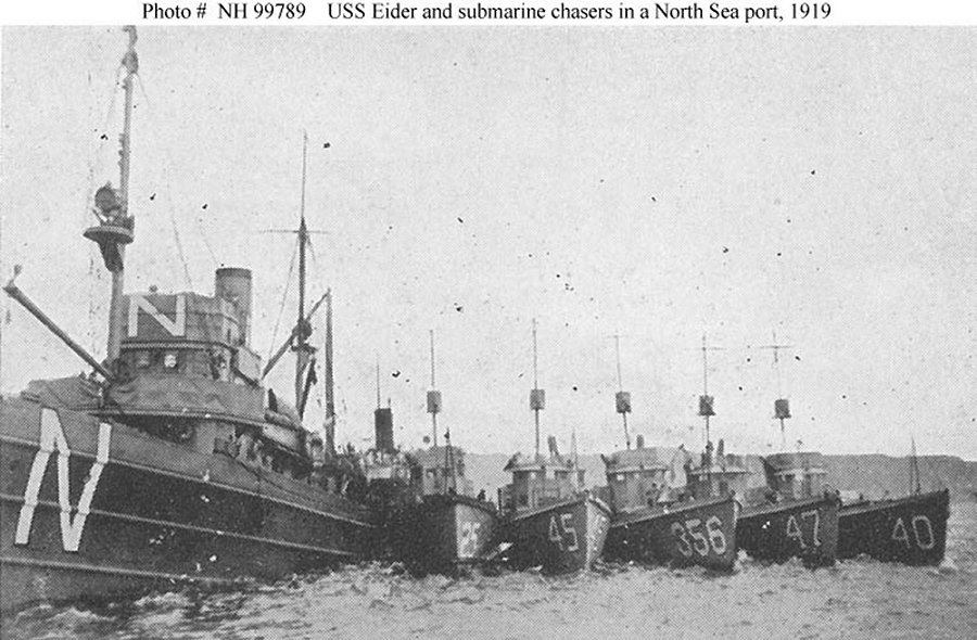 119k | USS Eider (Minesweeper No. 17) with identification letter "N" in a North Sea port, probably Kirkwall, Orkney Islands, during the the North Sea mine barrage clearance operation in 1919. She has several submarine chasers alongside including, from left to right: SC-25, SC-45, SC-356, SC-47 and SC-40.Halftone reproduction, published in the cruise book "Sweeping the North Sea Mine Barrage, 1919", page 142 Donation of Chief Storekeeper Charles A. Free U.S. Navy photo NH 99789 |