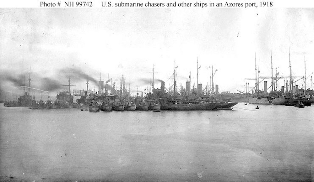 88k | In an Azores harbor with other ships of the U.S. and foreign navies, circa October 1918. The six subchasers in the left center of the view, with bows to the camera, are (from left to right): SC-223, SC-330, SC-180, SC-353, SC-331 and (probably) SC-356. Ships nested with them, to the right, include a "bird" type minesweeper and two converted yacht patrol vessels Collection of George K. Beach, who was a crewmember of USS SC-331 at the time U.S. Navy photo NH 99742 |