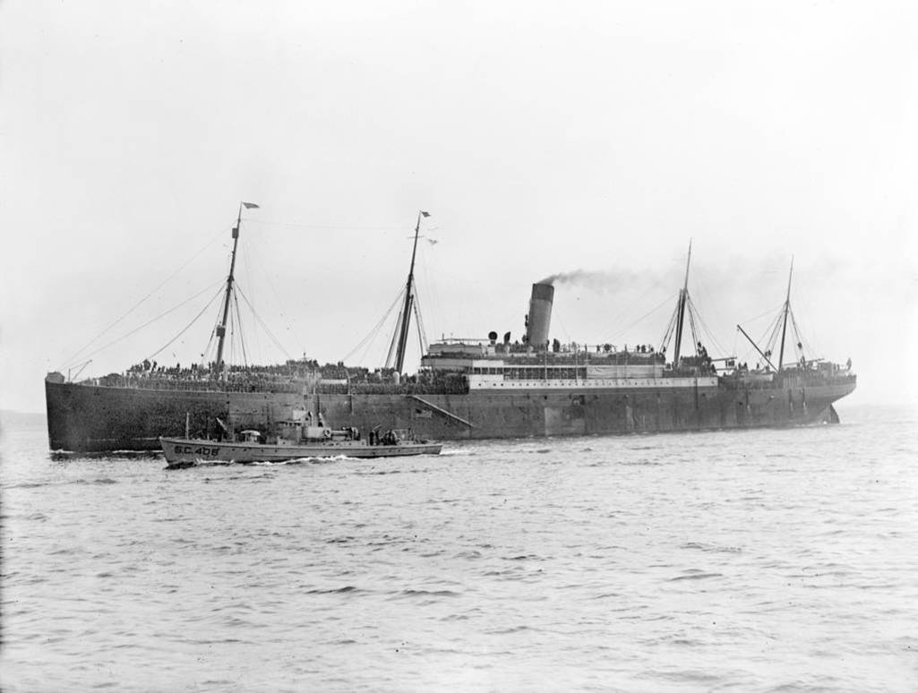 17 April 1919 USS Patricia arriving at Boston, MA from France with 2,783 troops on board, escorted by SC-408 |
