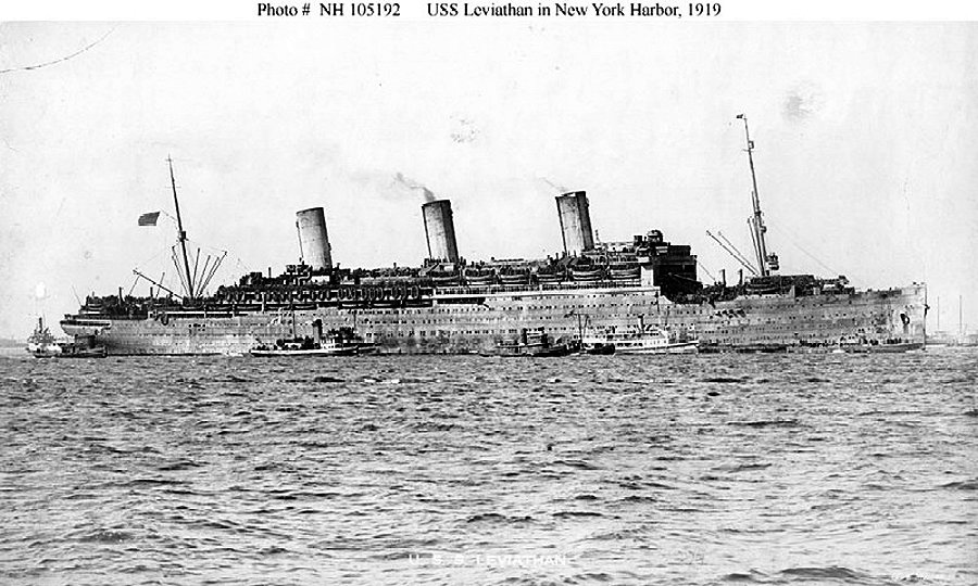 135k | USS Leviathan (ID 1326) in New York Harbor, March 1919, crowded with troops returning from France. She is accompanied by several tugs, an ambulance boat, and (alongside her bow) what appears to be USS SC-412. Photographed by E. Muller Jr., New York Naval Historical Center photo NH 105192 |