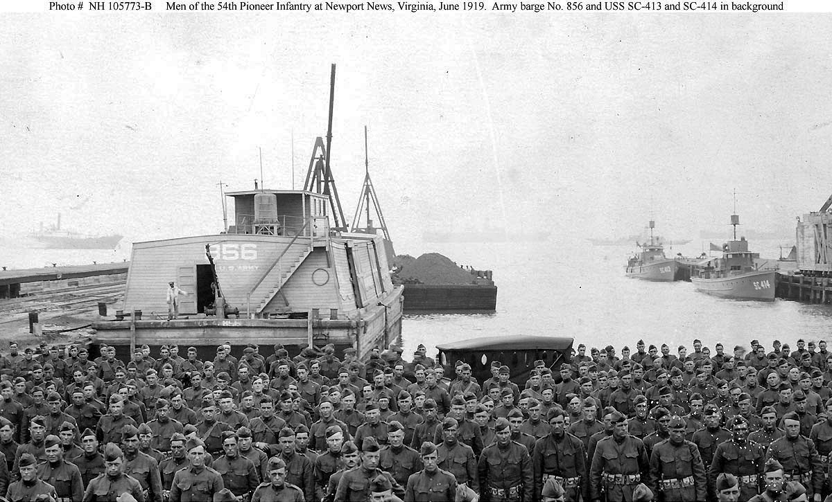 Troops of the 54th Pioneer Infantry Regiment in formation at Newport News, Virginia, after arriving from Europe on USS Artemis (ID-2187) on 26 June 1919. U.S. Army barge No. 856 is in the left background, with a loaded coal barge astern. U.S. Navy submarine chasers SC-413 and SC-414 are alongside the pier at right Photographed by Holladay, Newport News, Virginia Donation of Charles R. Haberlein Jr., 2008 Naval Historical Center photo NH 105773-B |