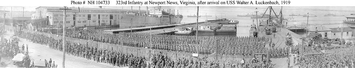 Original photo: At Newport News, Virginia, in 1919. Soldiers paraded in the foreground are members of the 323rd Infantry Regiment, U.S. Army, who had just arrived from Europe Donation of Dr. Mark Kulikowski, 2007 U.S. Navy photo NH 104733-B |
