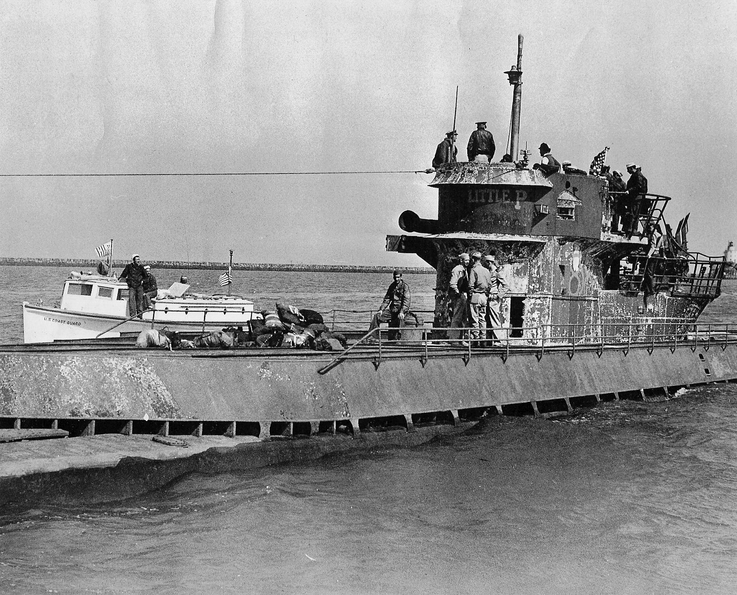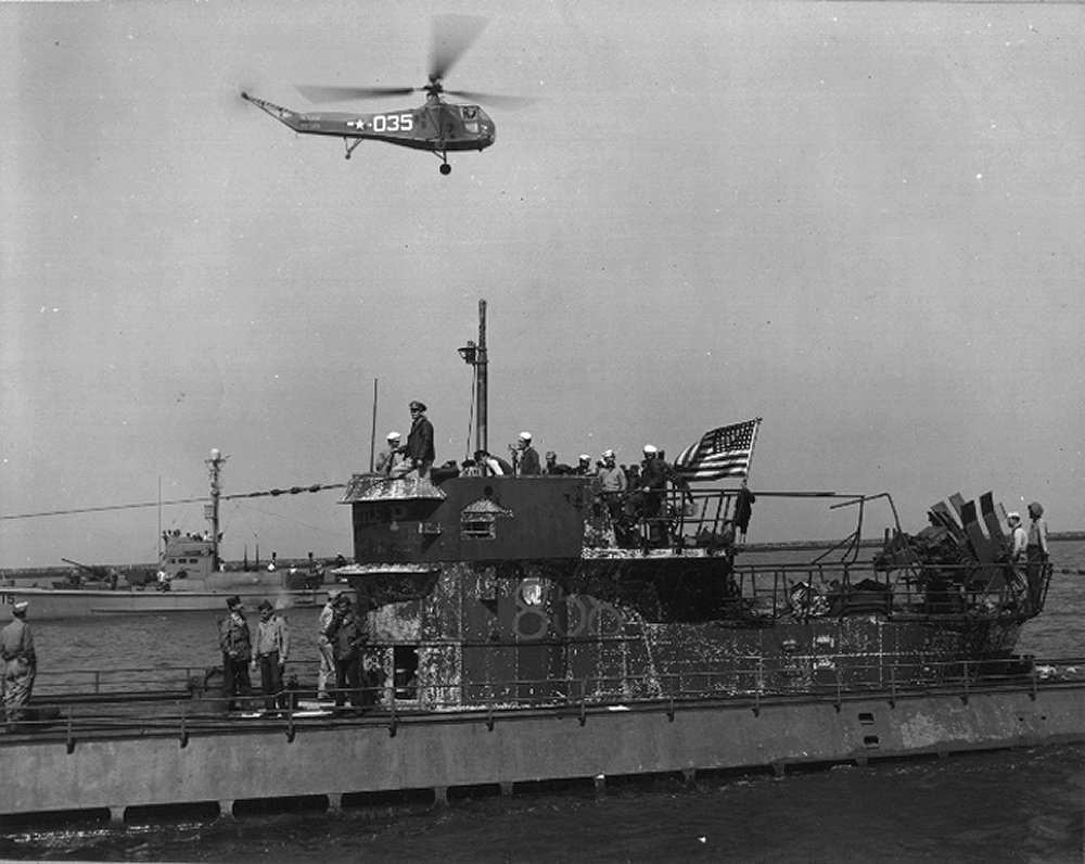 14 May 1945 Cape May, NJ U-858 at anchor, a Coast Guard HNS-1 Helicopter is overhead with SC-1015 in the background |