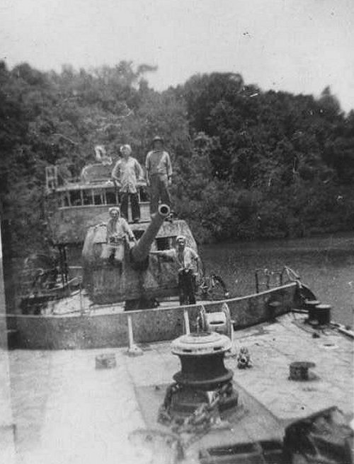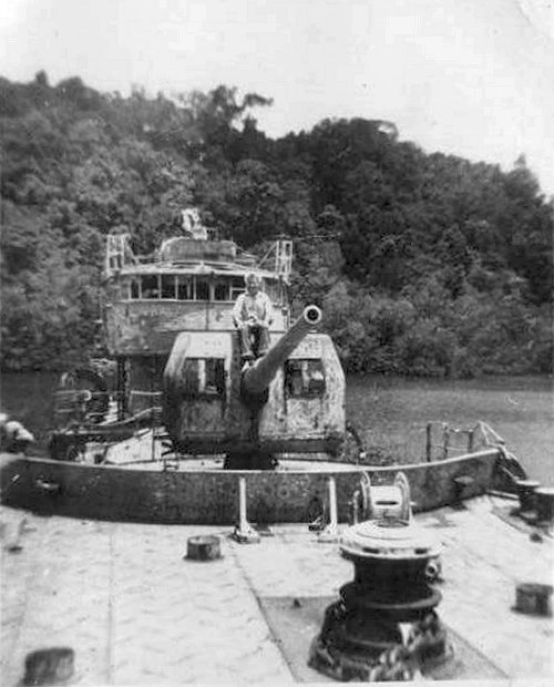12. On a beached Japanese destroyer at Tulagi. Callery and Dougherty standing on gun mount Grozier, sitting on mount and John Whetzal, with hand on barrel