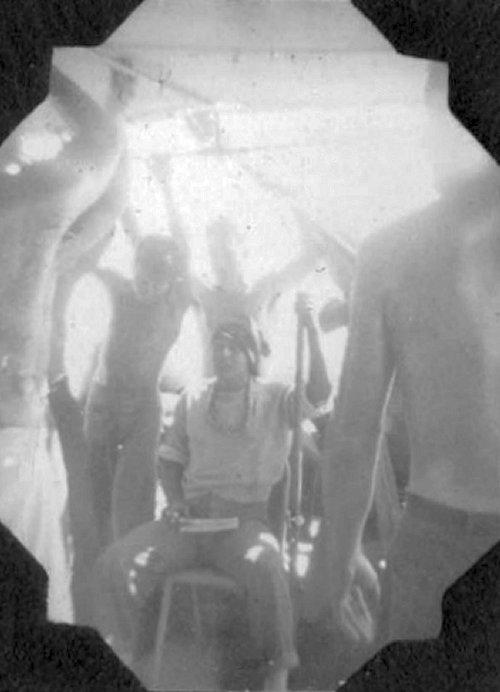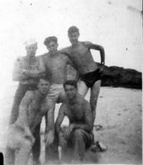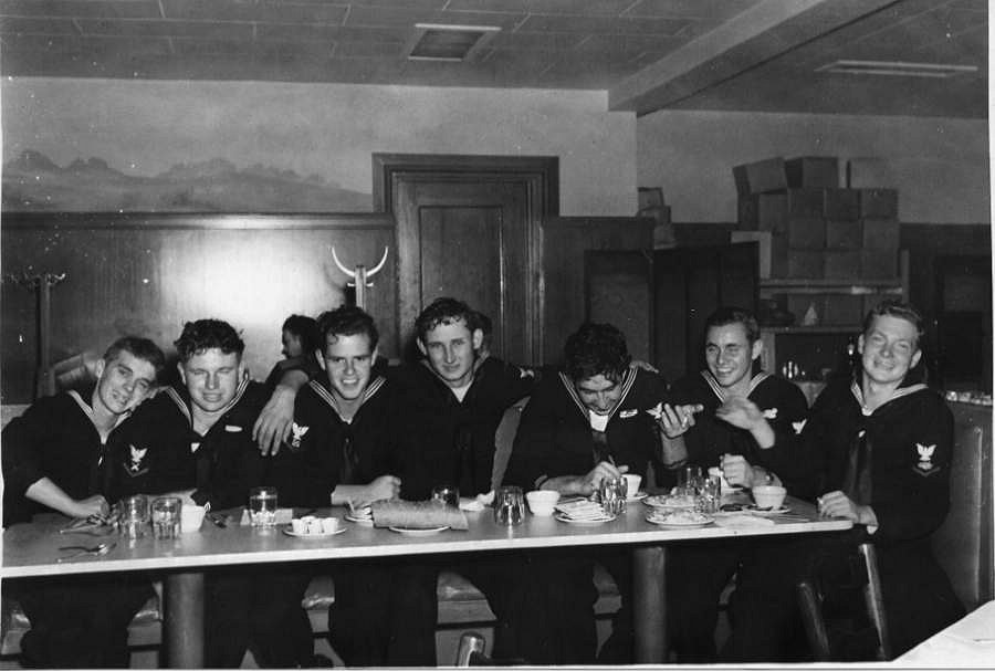 78. Decommissioning party November 1945 Left to right: Robert Davis, Eugene Russell, McRobbie, William Rees, Harry Hanshaw, John Whetzal and Hanson.