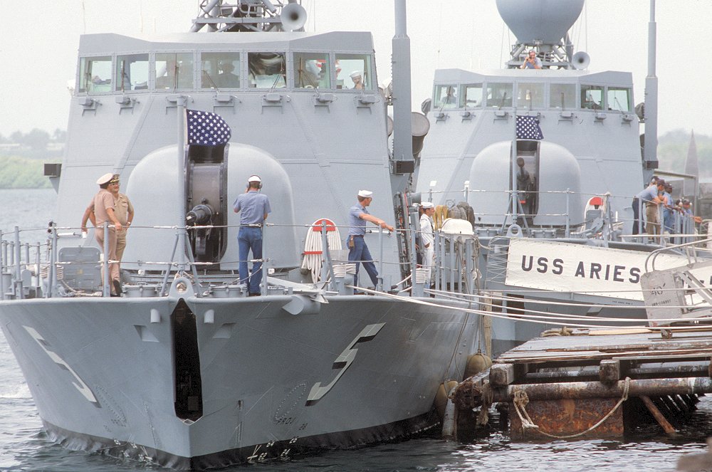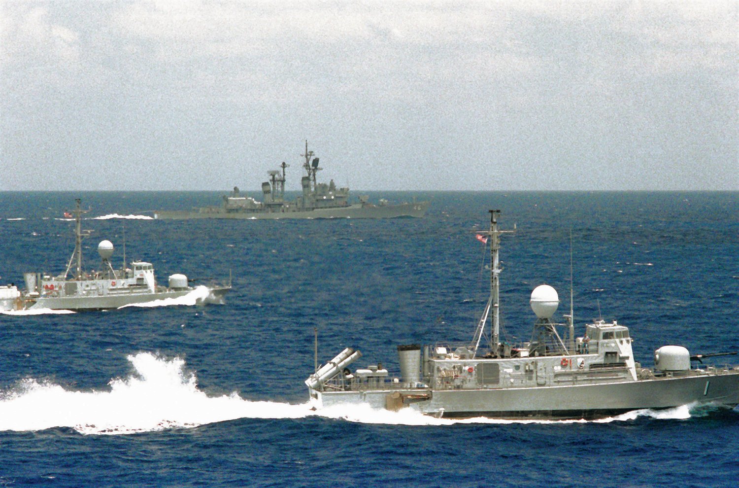 149k | 15 June 1984 The patrol combatant missile hydrofoils USS Hercules (PHM 2), front, and Aries lie tied up during the first phase of UNITAS XXV, the silver anniversary hemispheric naval exercise involving Brazil, Chile, Colombia, Ecuador, Peru, and the United States. Defense Visual Information photo DN-ST-90-01292 by JOCS Kirby Harrison, USN |