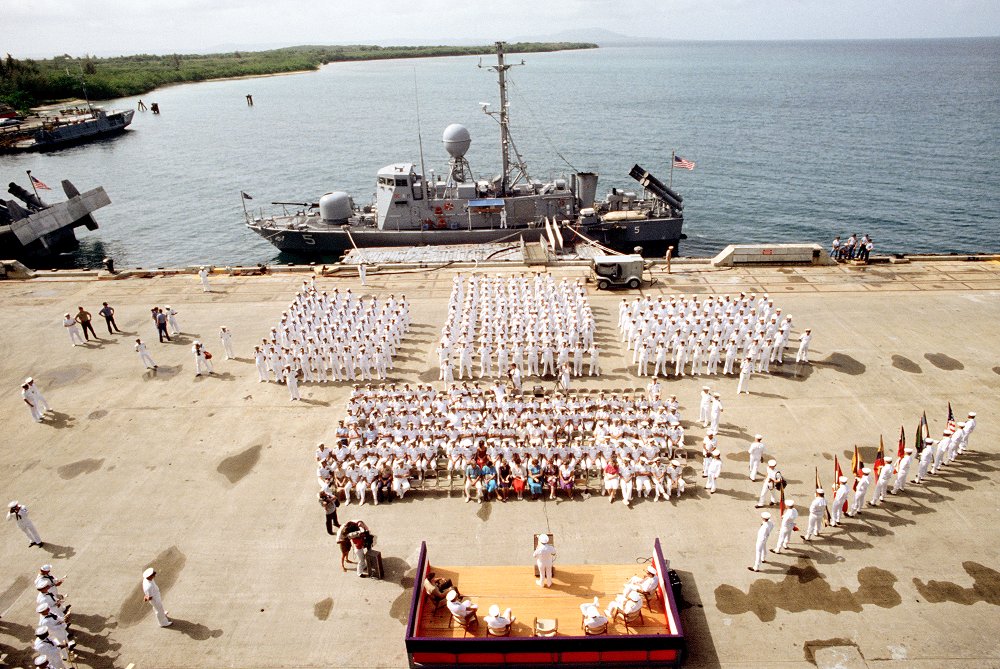 207k | 14 June 1984 NAS Roosevelt Roads, Puerto Rico A ceremony takes place to mark the beginning of Operation UNITAS XXV, a four and one-half month long exercise involving participants from the United States and South America. Visible in the background is the patrol combatant missile (hydrofoil) Aries. Defense Visual Information photo DN-ST-85-08181 by JOCS Kirby Harrison, USN |