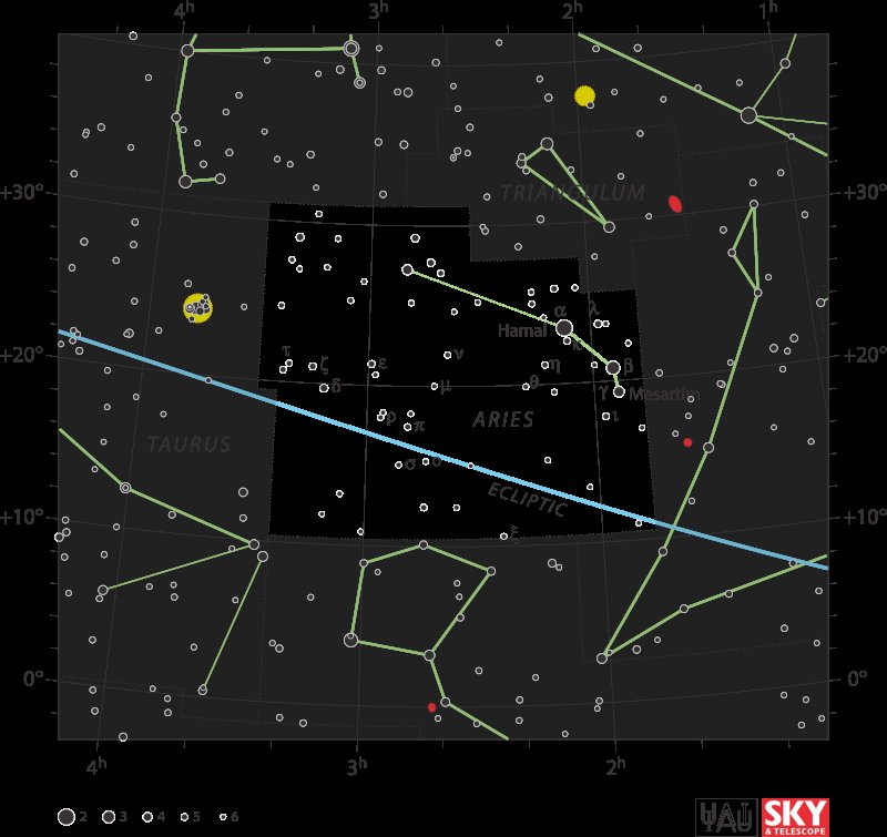 78k | Aries is one of the constellations of the zodiac. It is located in the Northern celestial hemisphere between Pisces to the west and Taurus to the east. The name Aries is Latin for ram, and its symbol represents a ram's horns. It is one of the 48 constellations described by the 2nd century astronomer Ptolemy, and remains one of the 88 modern constellations. It is a mid-sized constellation, ranking 39th overall size, with an area of 441 square degrees (1.1% of the celestial sphere) |