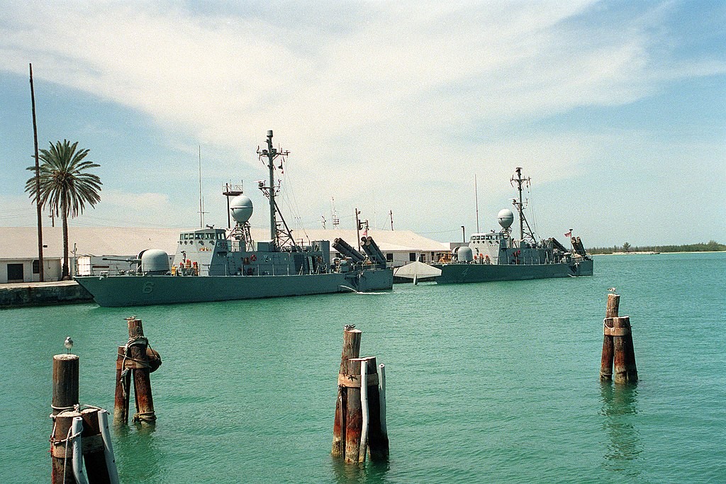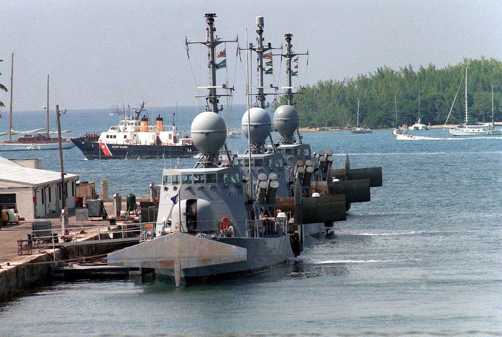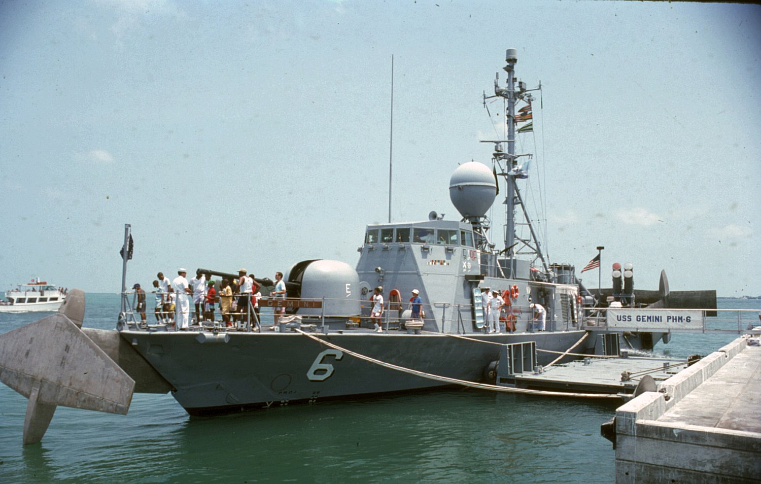 253k | Key West, FL A port bow view of the patrol combatant missile hydrofoils Gemini, left and the Aquila (PHM 4) moored to a pier. The Gemini's foils are deployed Naval History and Heritage Command photo DN-SC-93-03749 (18461586004). National Museum of the U.S. Navy |