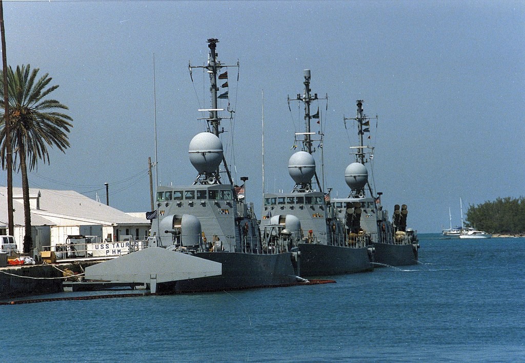236k | 1 November 1989 Key West, FL Patrol combatant missile hydrofoils USS Aquila (PHM 4), front, and Gemini, center, lie tied up in port with a third PHM (Probably Taurus (PHM 3). The Coast Guard surface effect ship USCGC Shearwater (WSES 3) is in the background Photo by PH2 (AC) Mark S. Kettenhofen Naval History and Heritage Command photo DN-SC-90-09333/National Archives Identifier (NAID) 6451967 |
