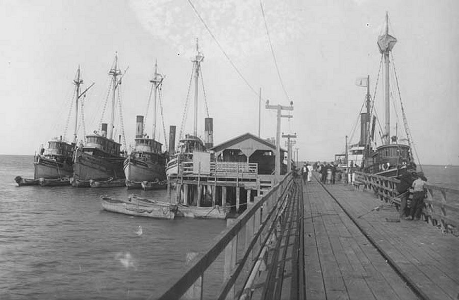 79k | c. 1920s On the left are the fishing boats Eugene F. Price, ex-SP-839; Peter C. Struven, James M. Gifford, and Mary B. Garner, ex-SP-682 at Queen Anne Pier, Lewes, DE Waller Studio photo from the Harold W. T. Purnell Photograph Collection |