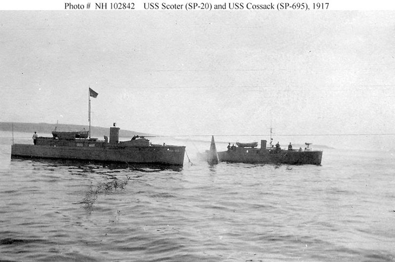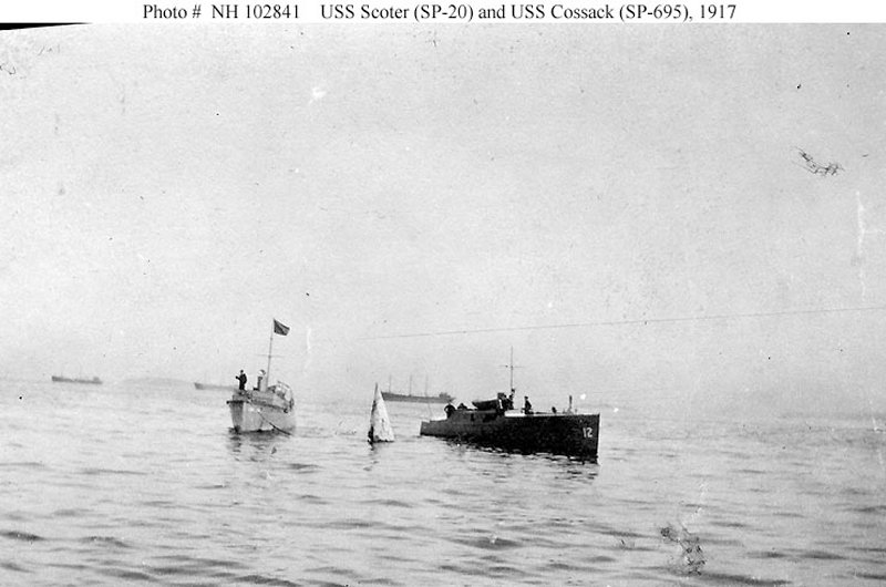 Scoter (SP-20), at left, and Cossack near a buoy, probably in the vicinity of Boston, Massachusetts, circa summer 1917 Collection of George K. Beach. U.S. Navy photos NH 102841 and NH 102842 |