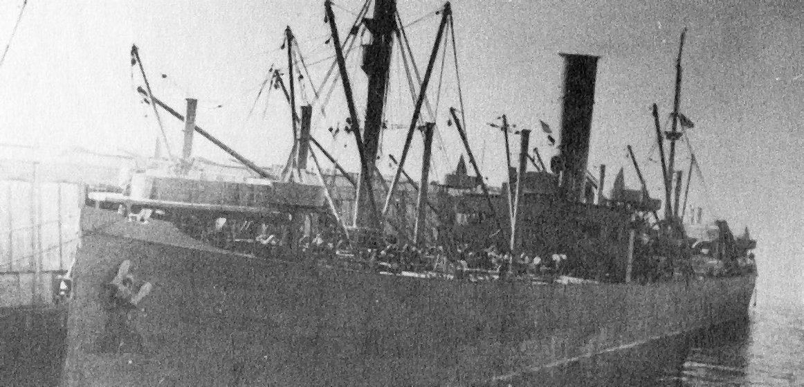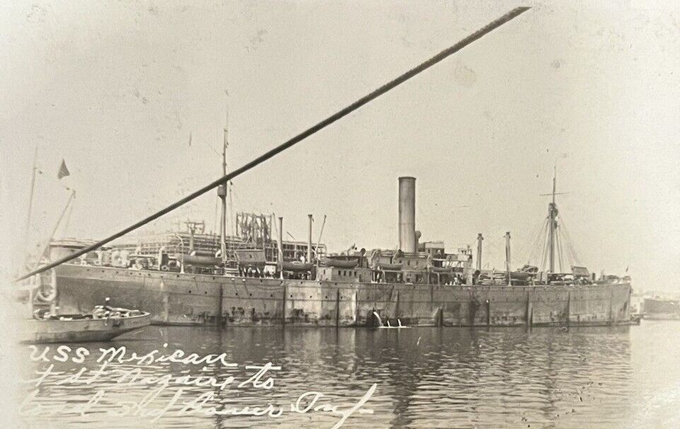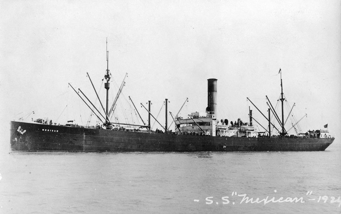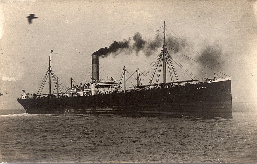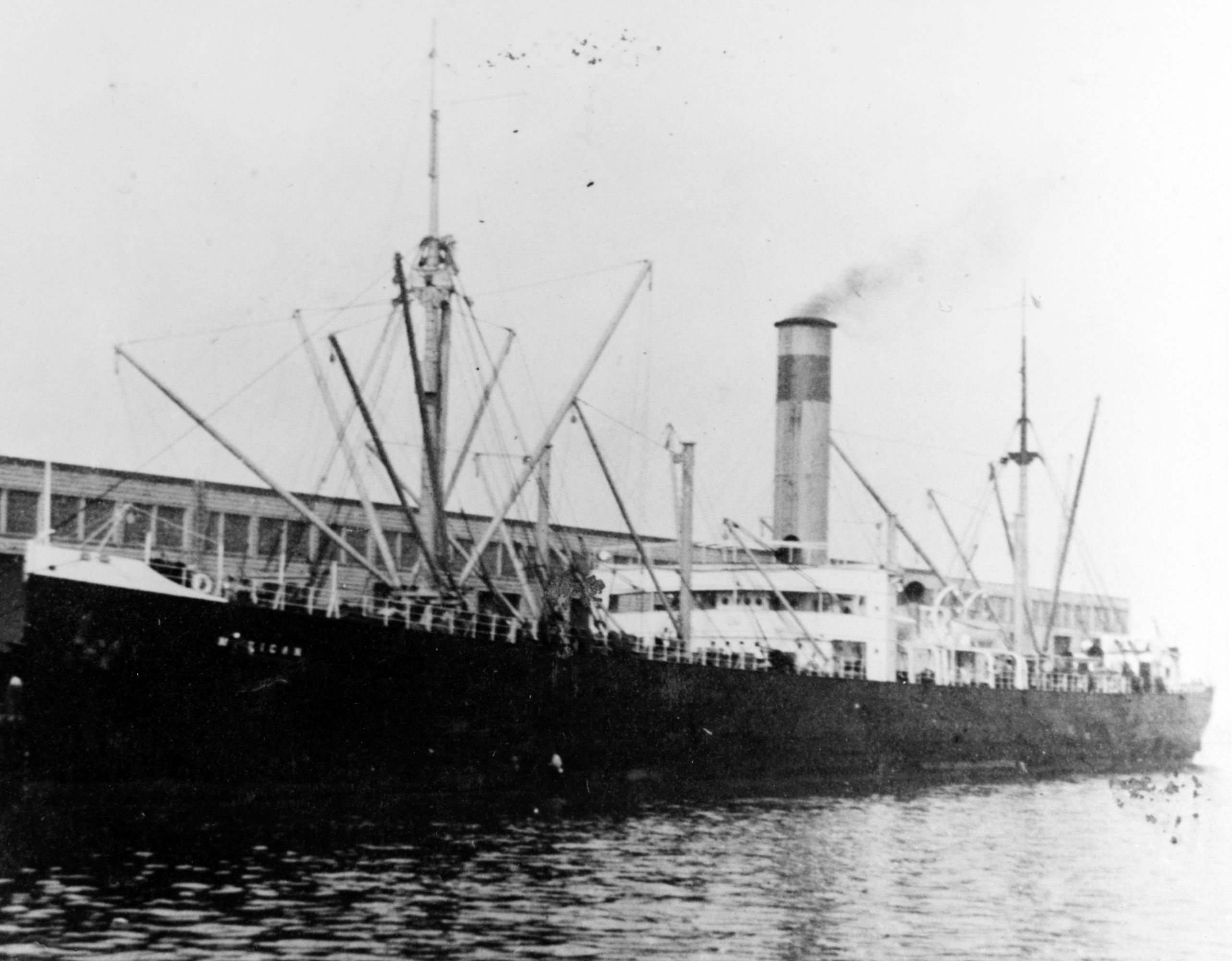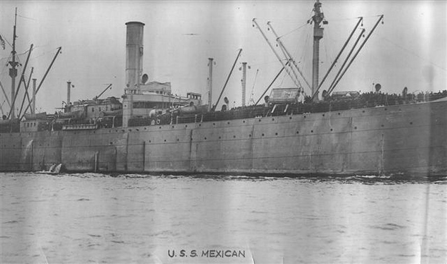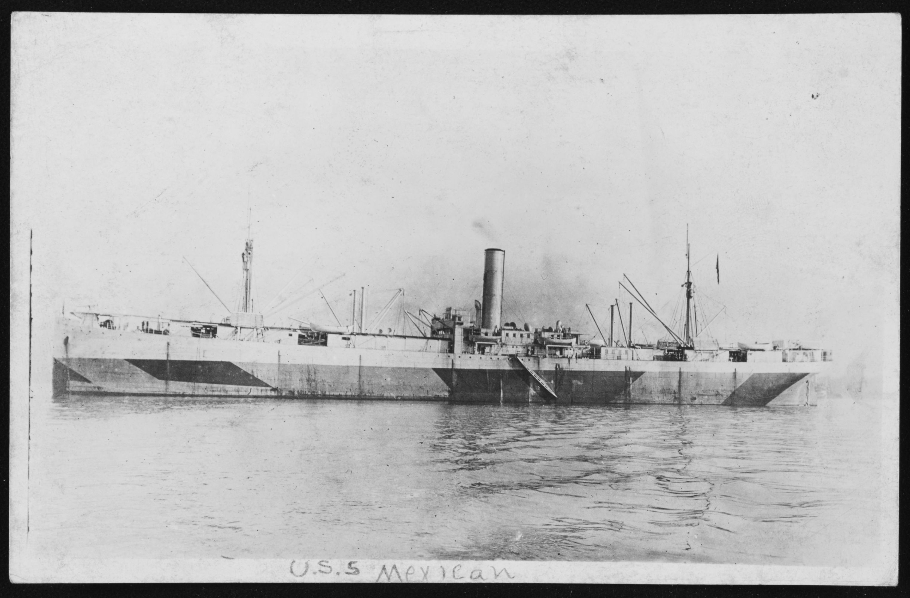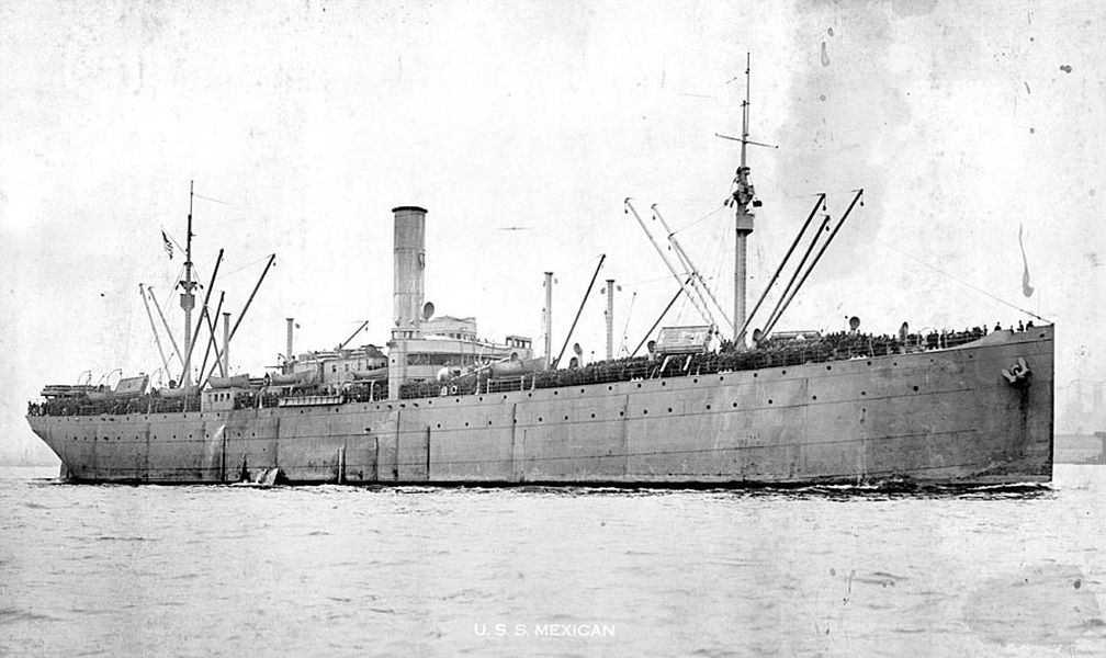433k | Photographed circa late 1918, possibly while undergoing conversion from an animal transport to a troopship. She appears to in the process of having her World War I "dazzle" camouflage replaced by an overall gray color scheme. The reverse of photo bears the following penciled inscription: "Left St. Nazair (sic) France Apr. 3 1918 in U.S. Ship Mexican." Naval History and Heritage Command photo NH 103457, donation of Dr. Mark Kulikowski, 2006 |