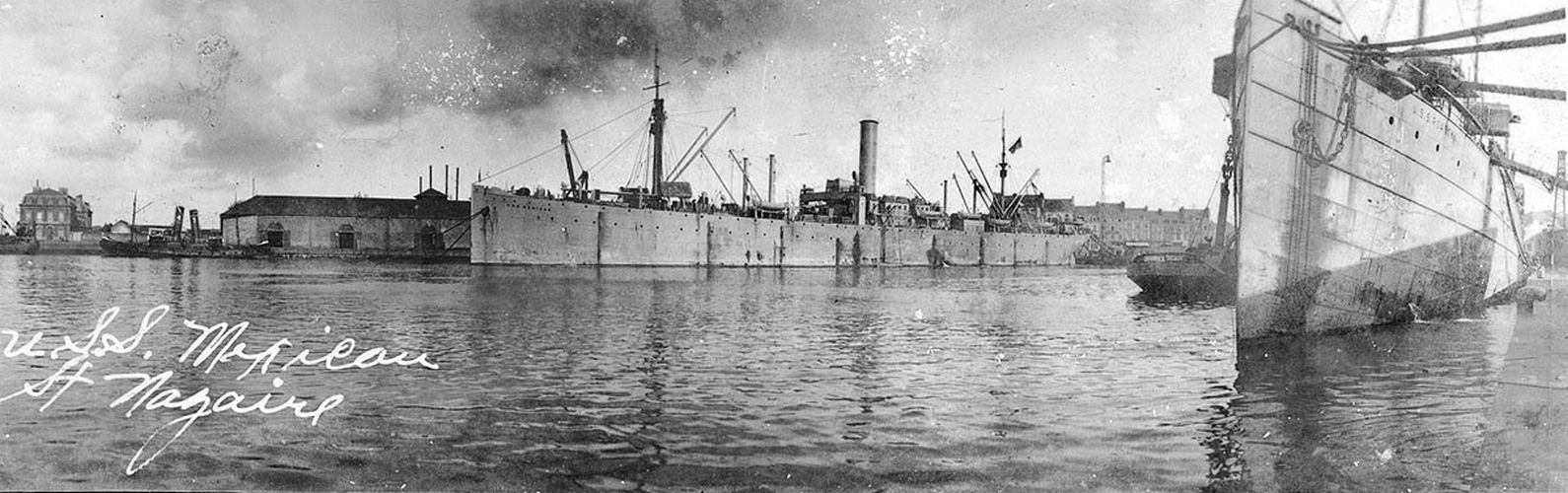162k | Panoramic photograph of the ship at St. Nazaire, France, in 1919, while serving as a troop transport. USS Roanoke (ID 1695), a former minelayer also employed as a troop transport, is at right. Naval History and Heritage Command photo NH 99394, courtesy of the Naval Historical Foundation. Collection of Lieutenant Charles Dutreaux |