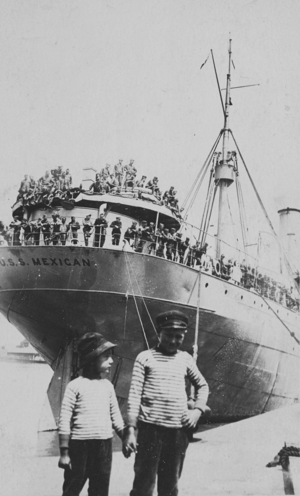 208k | Probably at St. Nazaire, France, with two children in the foreground, and homeward-bound troops on the ship's decks, circa 11 June 1919 Naval History and Heritage Command photo NH 105718 |