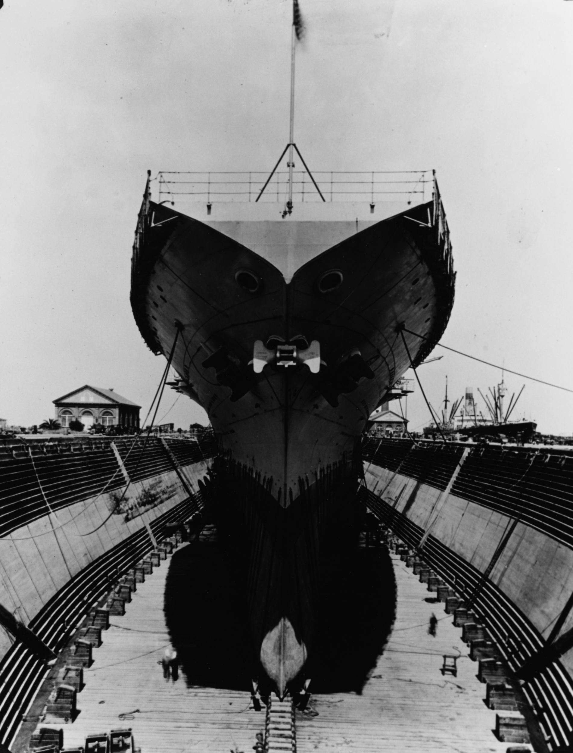 340k | Saratoga (CV-3) in drydock at Hunters Point, San Francisco, California, circa the early 1930s. Mexican is in the right distance Naval History and Heritage Command photo NH 94849, courtesy of PHC John Highfill, USN (Retired) |