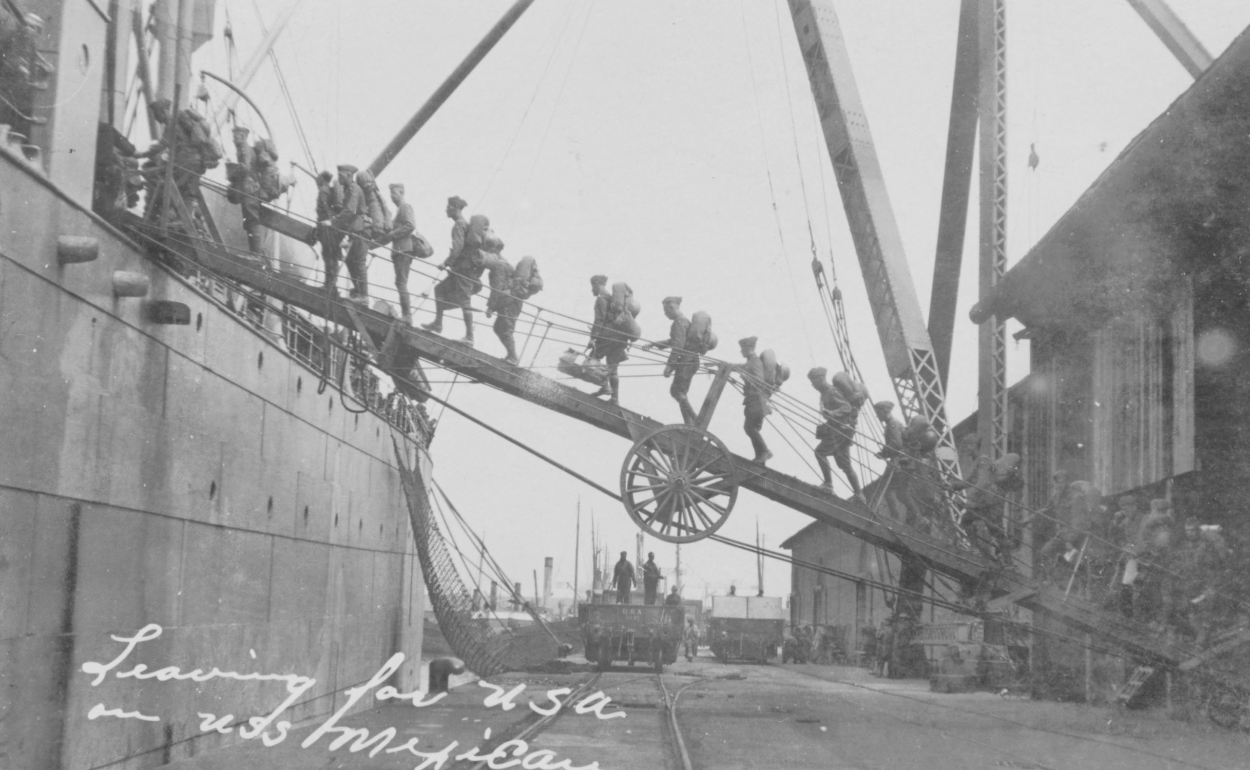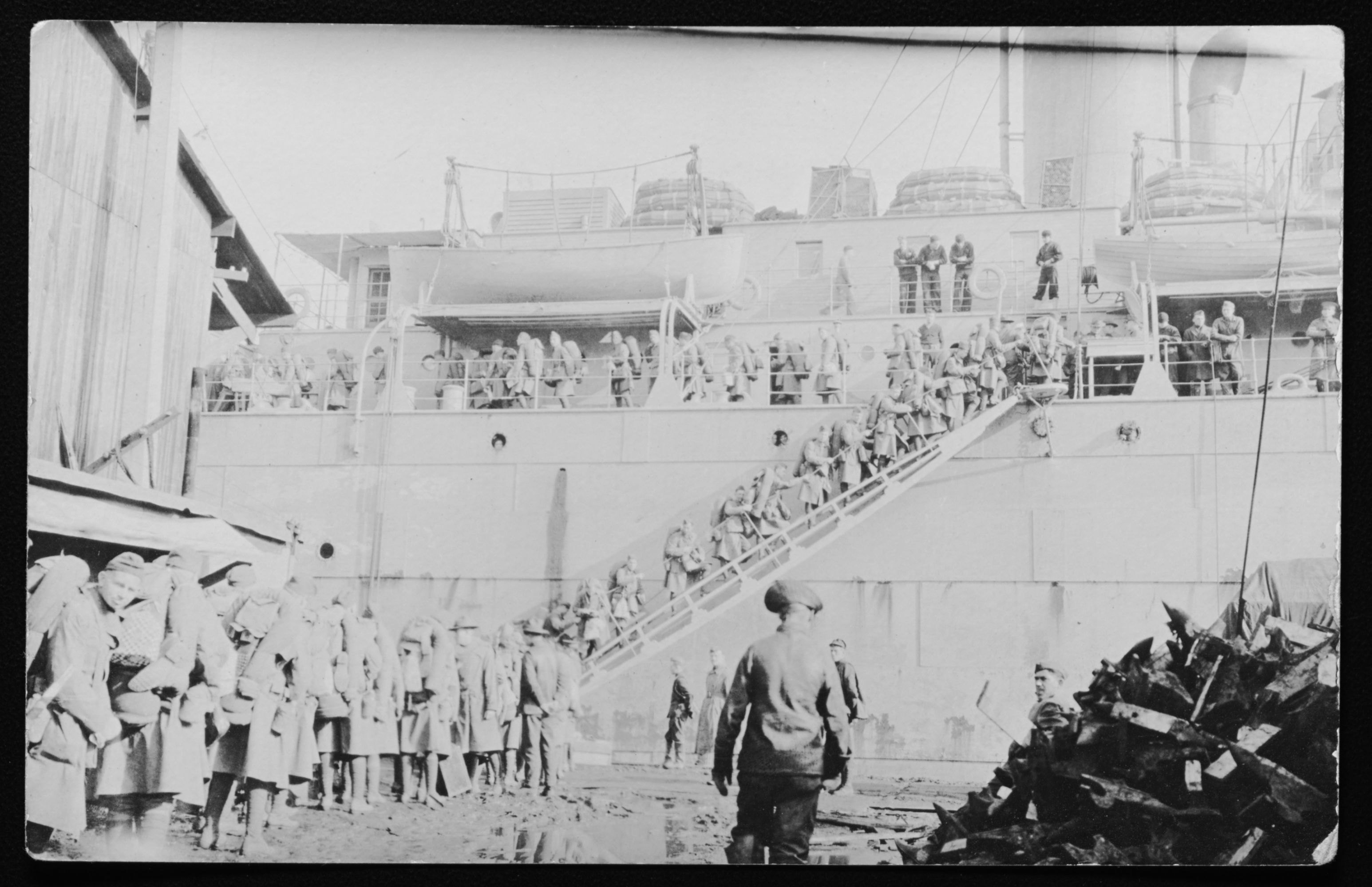 305k | Homeward-bound troops boarding the ship in a French port (probably St. Nazaire), 1919 Naval History and Heritage Command photo NH 107057, donation of Dr. Mark Kulikowski, 2010 |