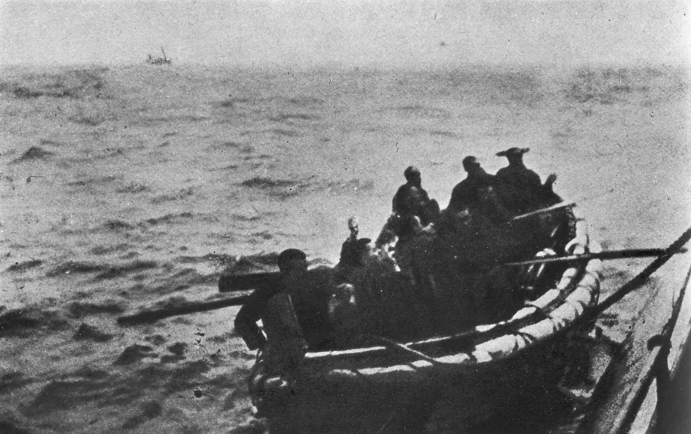 Photo taken from the deck of the enemy submarine shows the only surviving lifeboat from the transportTiconderoga comes alongside the U-152. The occupants were forced to hold up their hands at the point of revolvers in the hands of the U-boat's crew. In the back ground Ticonderoga may been seen on the horizon line four minutes before she sank Photo from "A History Of The Transport Service: Adventures And Experiences Of The United States Transports And Cruisers In The World War", by Vice Admiral Albert Gleaves, USN, Published by George H. Doran Company, New York |