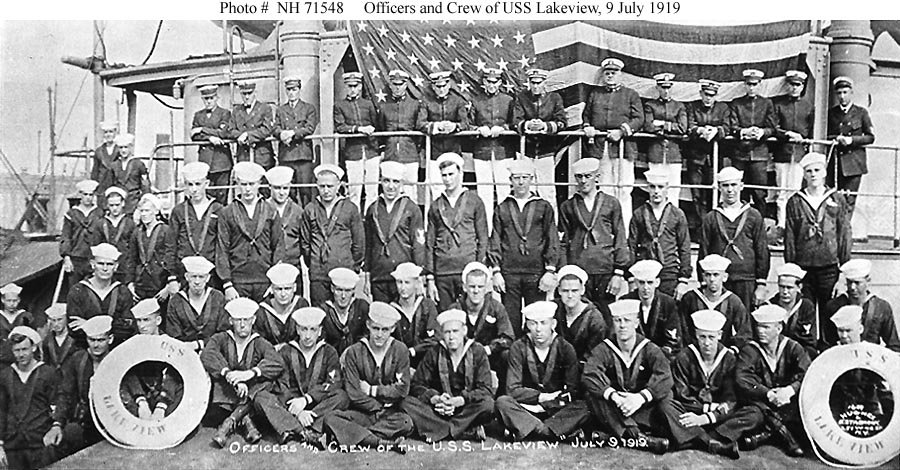 Ship's Officers and Crew posed on the after end of her superstructure, 9 July 1919 Photographed by Hughes and Estabrook, 251 W. 42nd St., New York City Courtesy Donald M. McPherson, 1970 Naval History and Heritage Command photo NH 71548 |