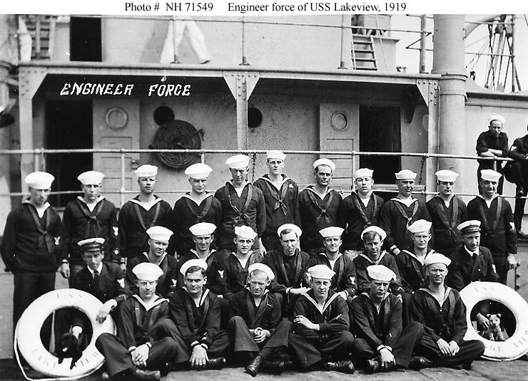 Enlisted Men of the ship's Engineer Force, posed on the after end of her superstructure, 1919 Probably photographed by Hughes and Estabrook, 251 W. 42nd St., New York City, on or about 9 July 1919 Courtesy Donald M. McPherson, 1970 Naval History and Heritage Command photo NH 71549 |