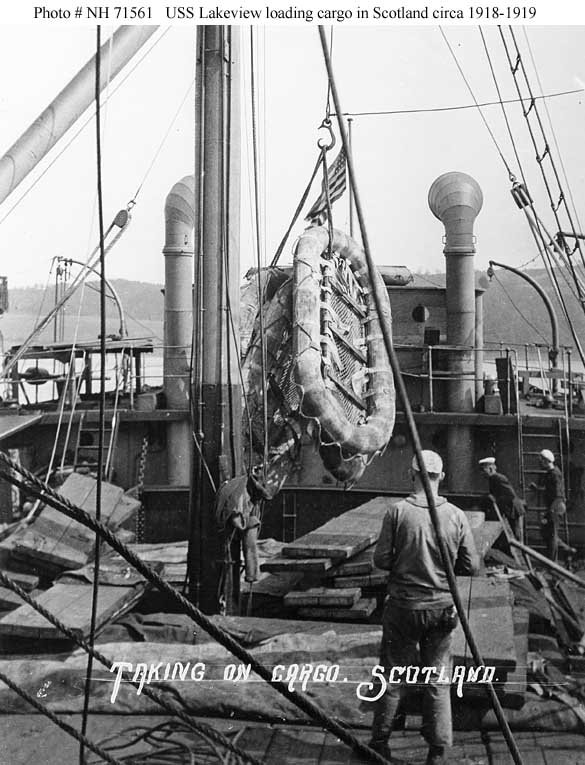 c. 1918/1919 In a Scottish port, shows her loading a cargo of life rafts during that period Courtesy Donald McPherson, 1970 Naval History and Heritage Command photo NH 71561 |
